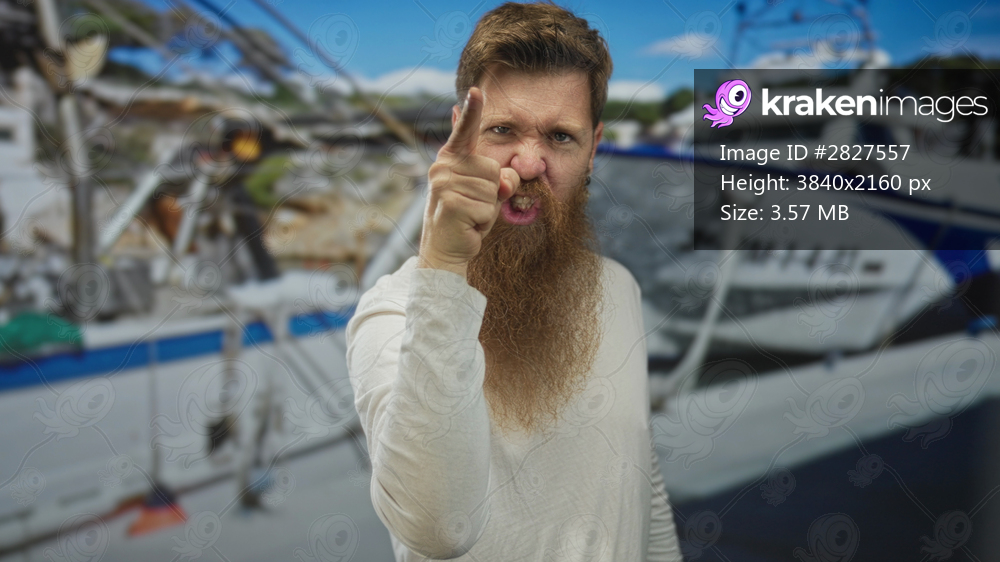 Bearded man pointing finger at camera at port beside white boat on sunny dock under clear blue sky; anger.