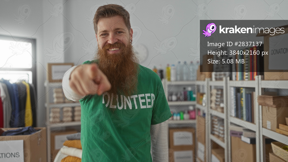Bearded man pointing finger in donation building beside clothes box and shelves; support motivation.