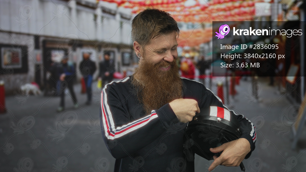 Bearded man pointing finger to camera while holding helmet under hanging lanterns on a busy street; confidence boldness empowerment assertiveness.