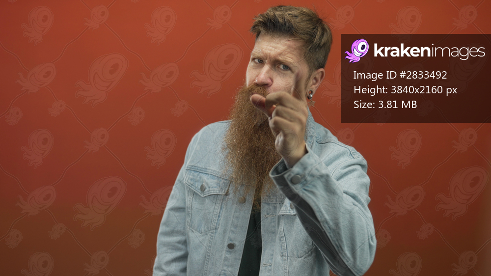 Bearded man pointing finger towards the camera in a red studio; challenge defiance assertion urgency.