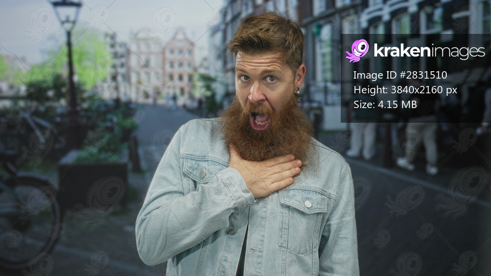 Bearded man with red beard and denim jacket clutching chest on street in daylight with wide open mouth; surprise.