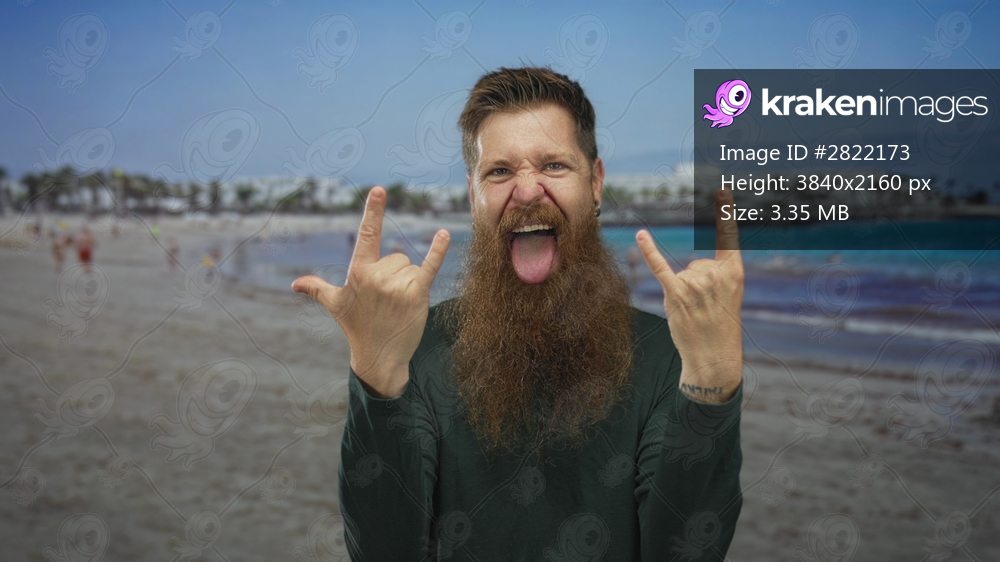 Bearded man sticks out tongue and flashes rock horns gesture at beachfront building facade; playful joy.