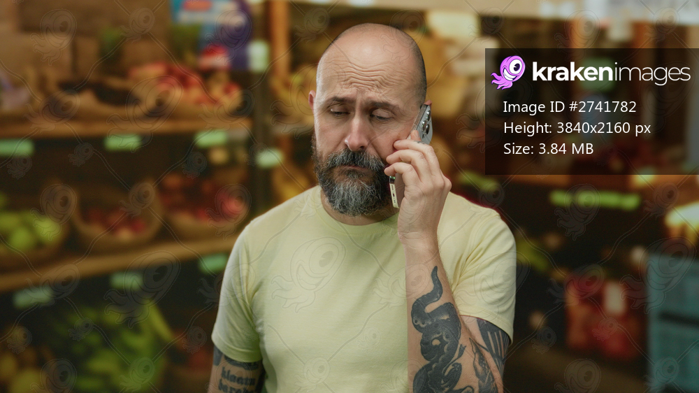 Bearded man talking on phone in outdoor fruit market with fresh produce and tattooed arm visible, creating a modern and urban shopping scene.