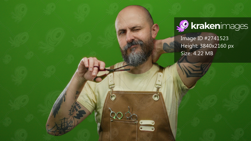 Bearded man with tattoos holds scissors, wearing apron against green background, expressing tiredness and contemplation.