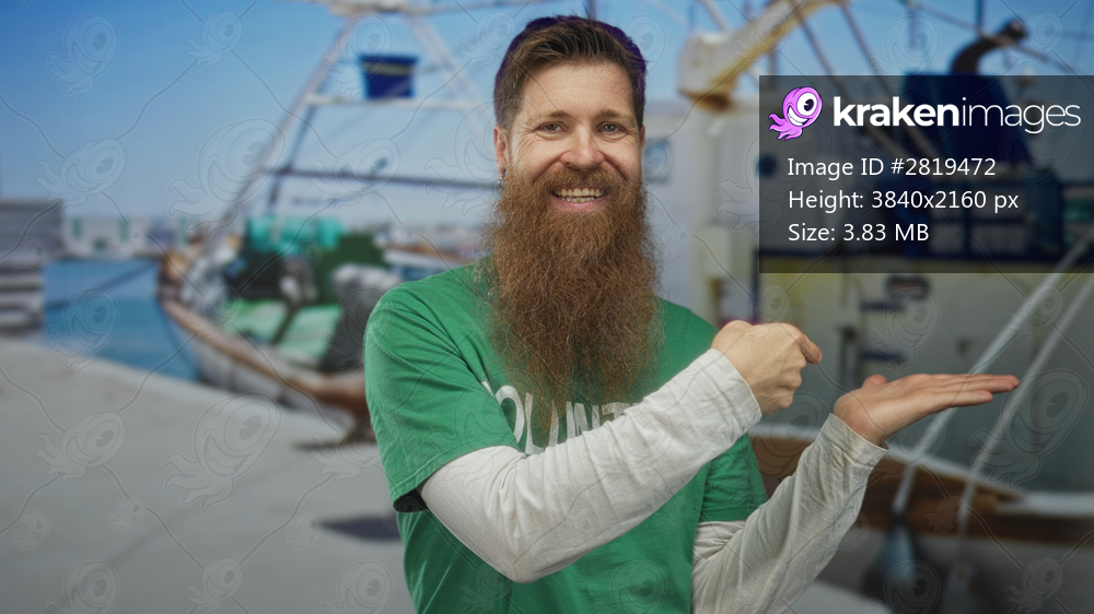 Bearded man volunteer in green shirt smiling while giving thumbs up gesture by boat on street; optimism.