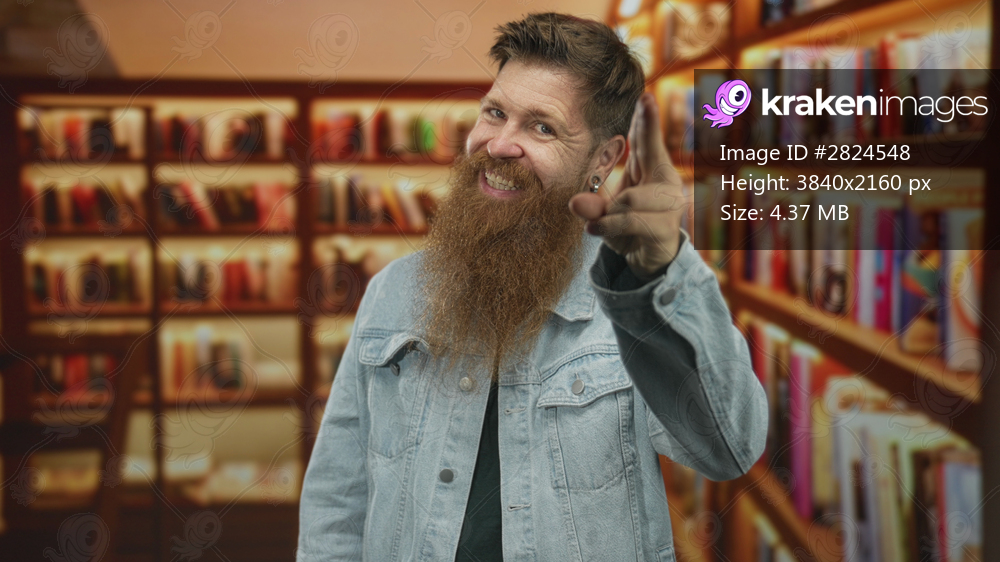 Bearded man wearing denim jacket salutes with two fingers to head among wooden bookshelves in spacious library building interior; greeting respect.