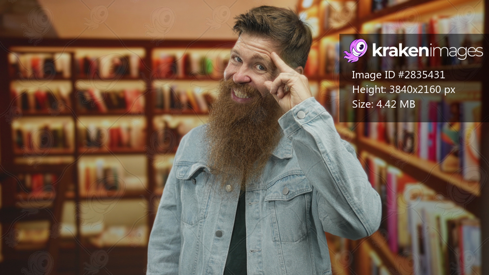 Bearded man wearing denim jacket salutes with two fingers to head among wooden bookshelves in spacious library building interior; greeting respect.