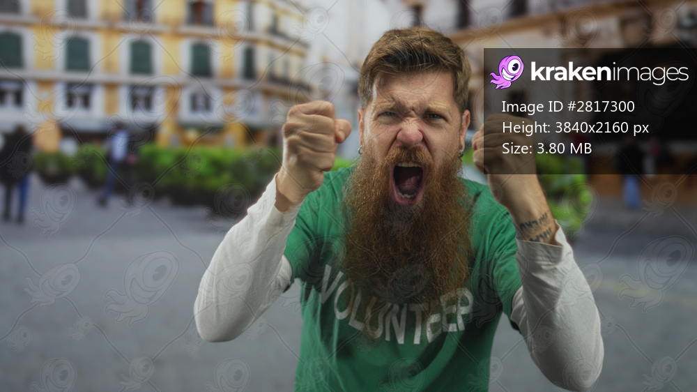 Bearded man wearing volunteer shirt with open mouth shouting and clenching fists on busy city street; anger defiance.