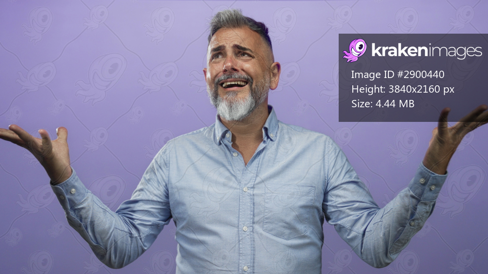 Bearded middle aged man shrugging with raised hands and open palms in studio purple backdrop; frustration.
