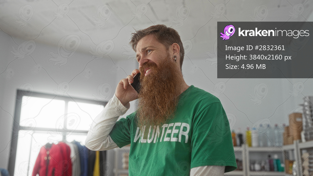 Bearded volunteer man holding smartphone to ear and smiling inside a building donation center; generosity support.