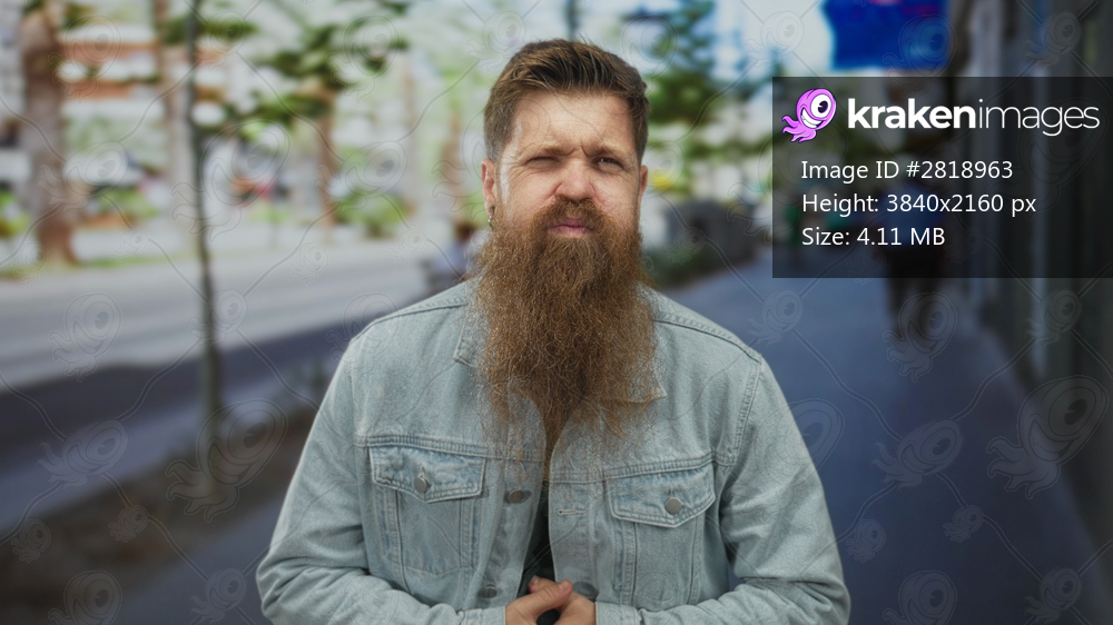Bearded young man wearing denim jacket and green shirt clutches stomach with both hands on urban street with blurred pedestrians; pain.
