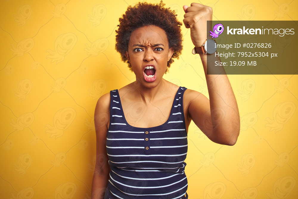 Beauitul african american woman wearing summer t-shirt over isolated yellow background angry and mad raising fist frustrated and furious while shouting with anger. Rage and aggressive concept. - Kraken Images
