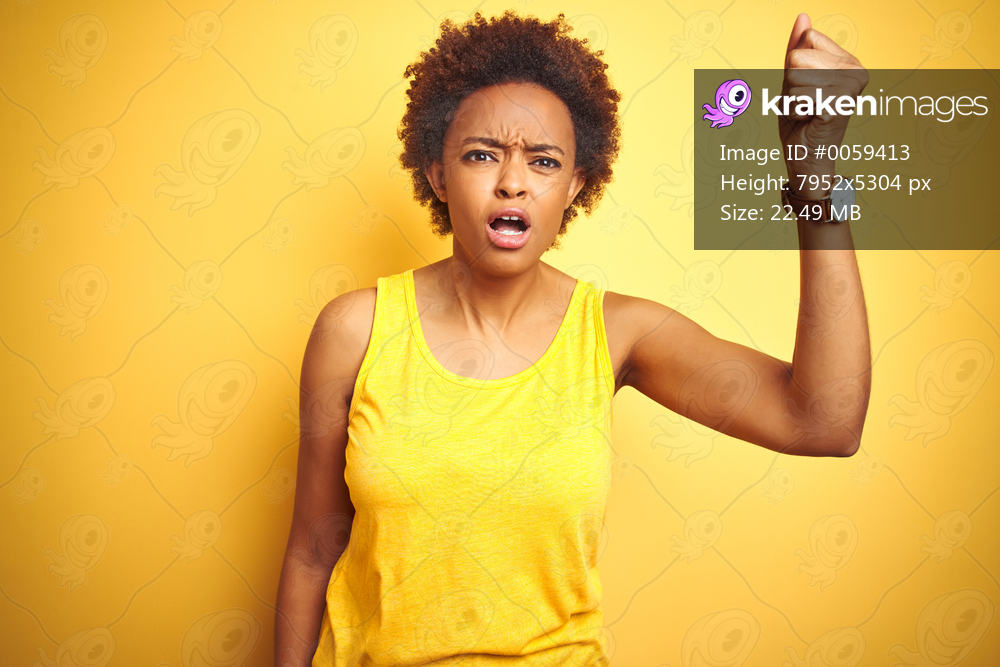 Beauitul african american woman wearing summer t-shirt over isolated yellow background angry and mad raising fist frustrated and furious while shouting with anger. Rage and aggressive concept. - Kraken Images
