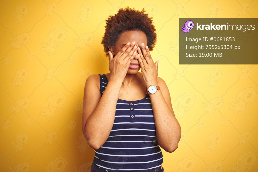 Beauitul african american woman wearing summer t-shirt over isolated yellow background rubbing eyes for fatigue and headache, sleepy and tired expression. Vision problem - Kraken Images