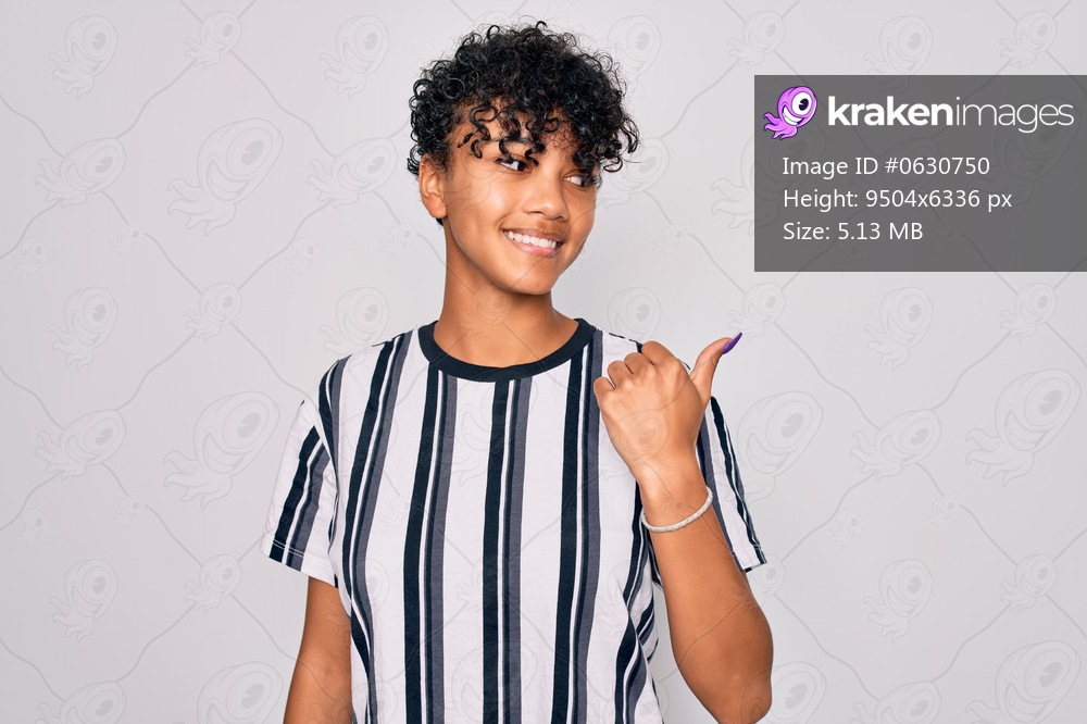 Beautiful african american afro woman wearing casual striped t-shirt over white background smiling with happy face looking and pointing to the side with thumb up. - Kraken Images