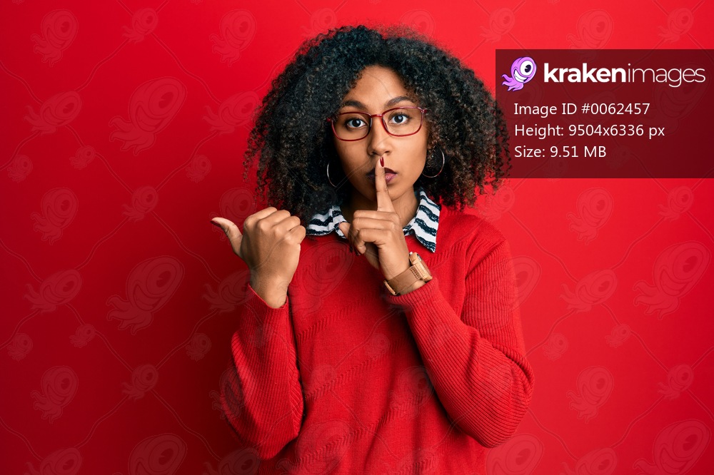 Beautiful african american woman with afro hair wearing sweater and glasses asking to be quiet with finger on lips pointing with hand to the side. silence and secret concept. - Kraken Images