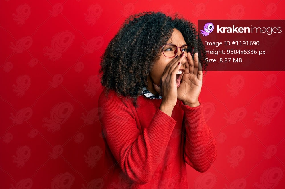 Beautiful african american woman with afro hair wearing sweater and glasses shouting angry out loud with hands over mouth