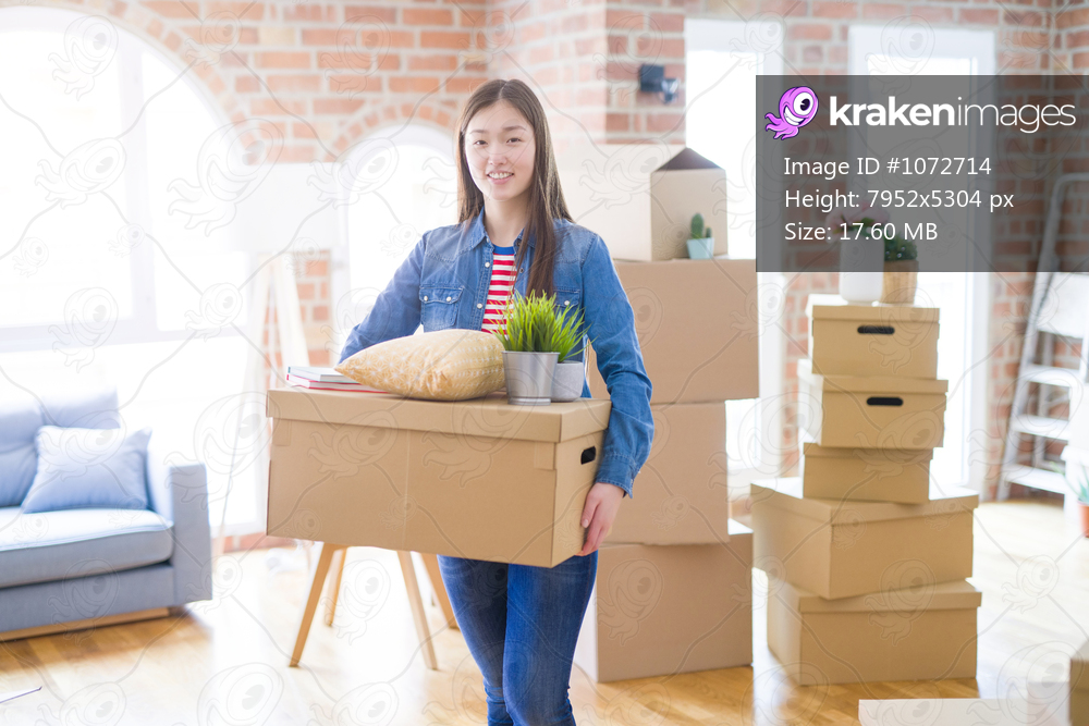 Beautiful asian young woman holding boxes, smiling happy moving to a new home