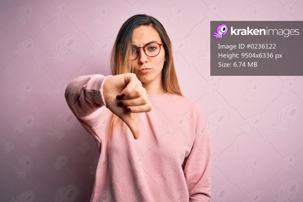 Beautiful blonde woman with blue eyes wearing sweater and glasses over pink background looking unhappy and angry showing rejection and negative with thumbs down gesture. Bad expression. - Kraken Images