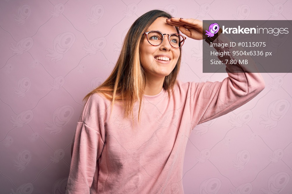 Beautiful blonde woman with blue eyes wearing sweater and glasses over pink background very happy and smiling looking far away with hand over head. Searching concept. - Kraken Images