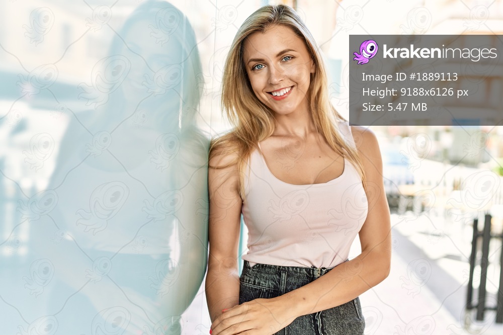 Beautiful blonde woman smiling happy outdoors on a sunny day leaning on the wall