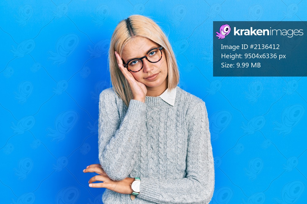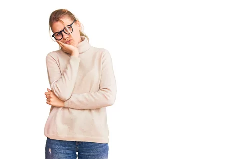 Beautiful blonde woman wearing glasses thinking looking tired and bored with depression problems with crossed arms.