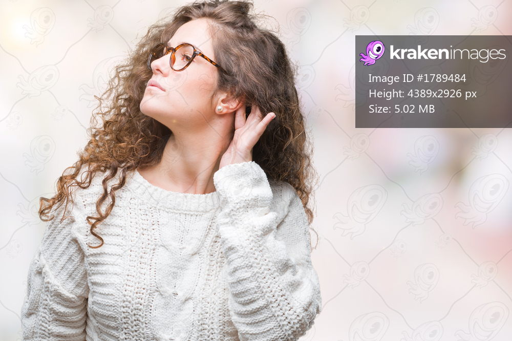 Beautiful brunette curly hair young girl wearing winter sweater over isolated background smiling with hand over ear listening an hearing to rumor or gossip. Deafness concept. - Kraken Images