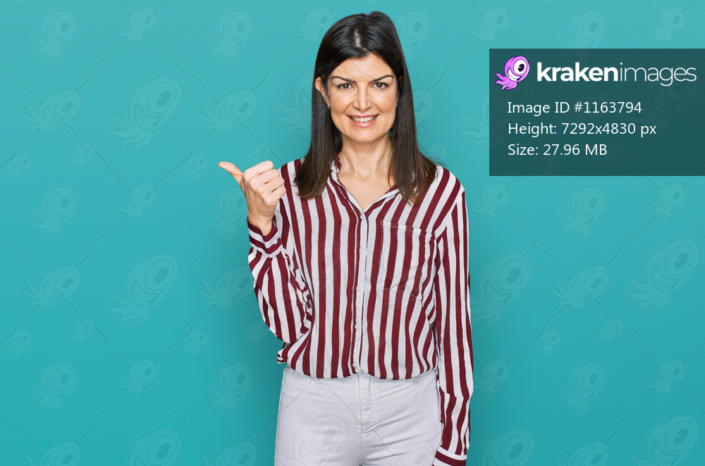 Beautiful brunette woman wearing striped shirt smiling with happy face looking and pointing to the side with thumb up.