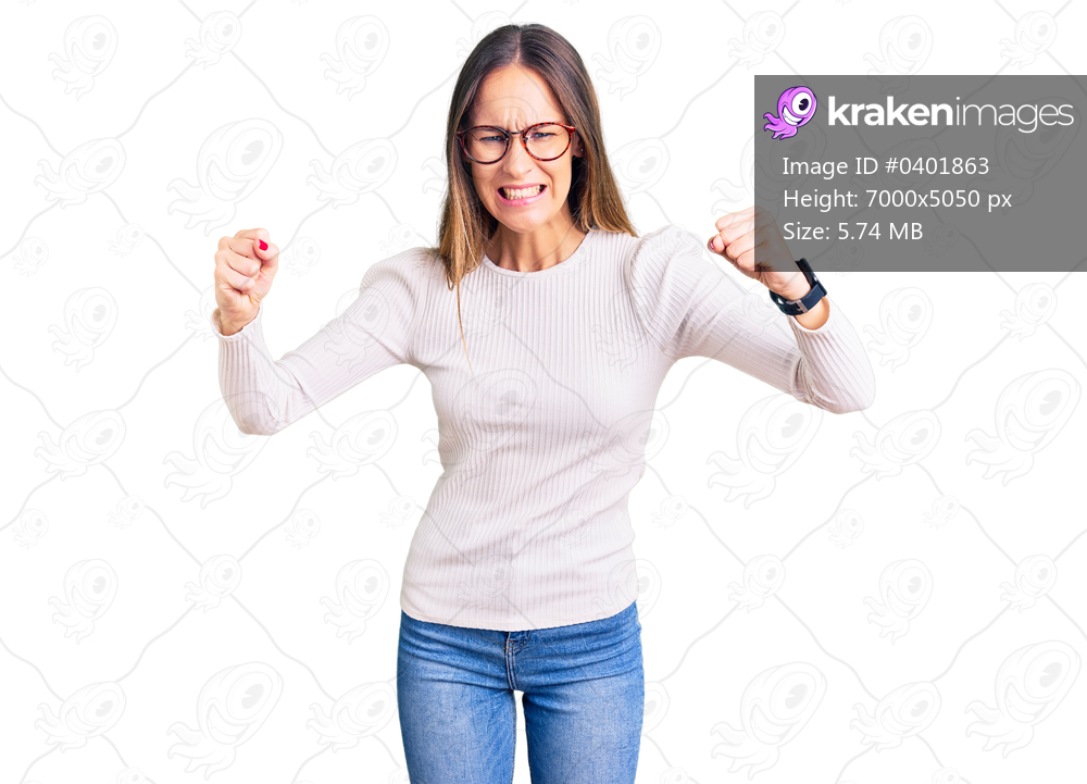 Beautiful brunette young woman wearing casual white sweater and glasses angry and mad raising fists frustrated and furious while shouting with anger. rage and aggressive concept. - Kraken Images