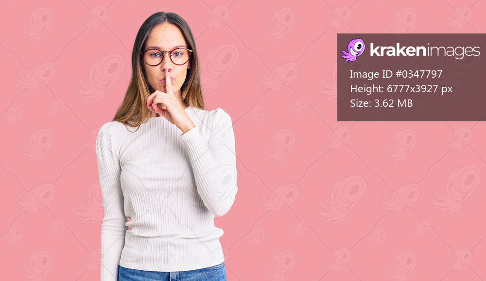Beautiful brunette young woman wearing casual white sweater and glasses asking to be quiet with finger on lips. silence and secret concept.