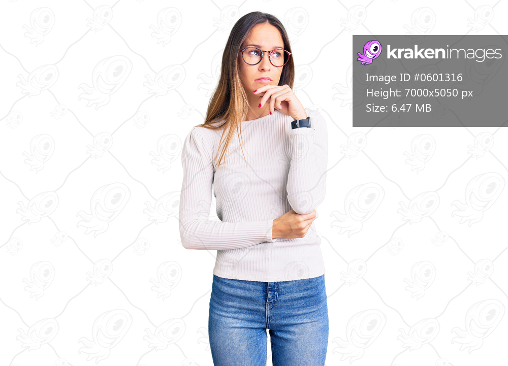 Beautiful brunette young woman wearing casual white sweater and glasses with hand on chin thinking about question, pensive expression. smiling with thoughtful face. doubt concept. - Kraken Images