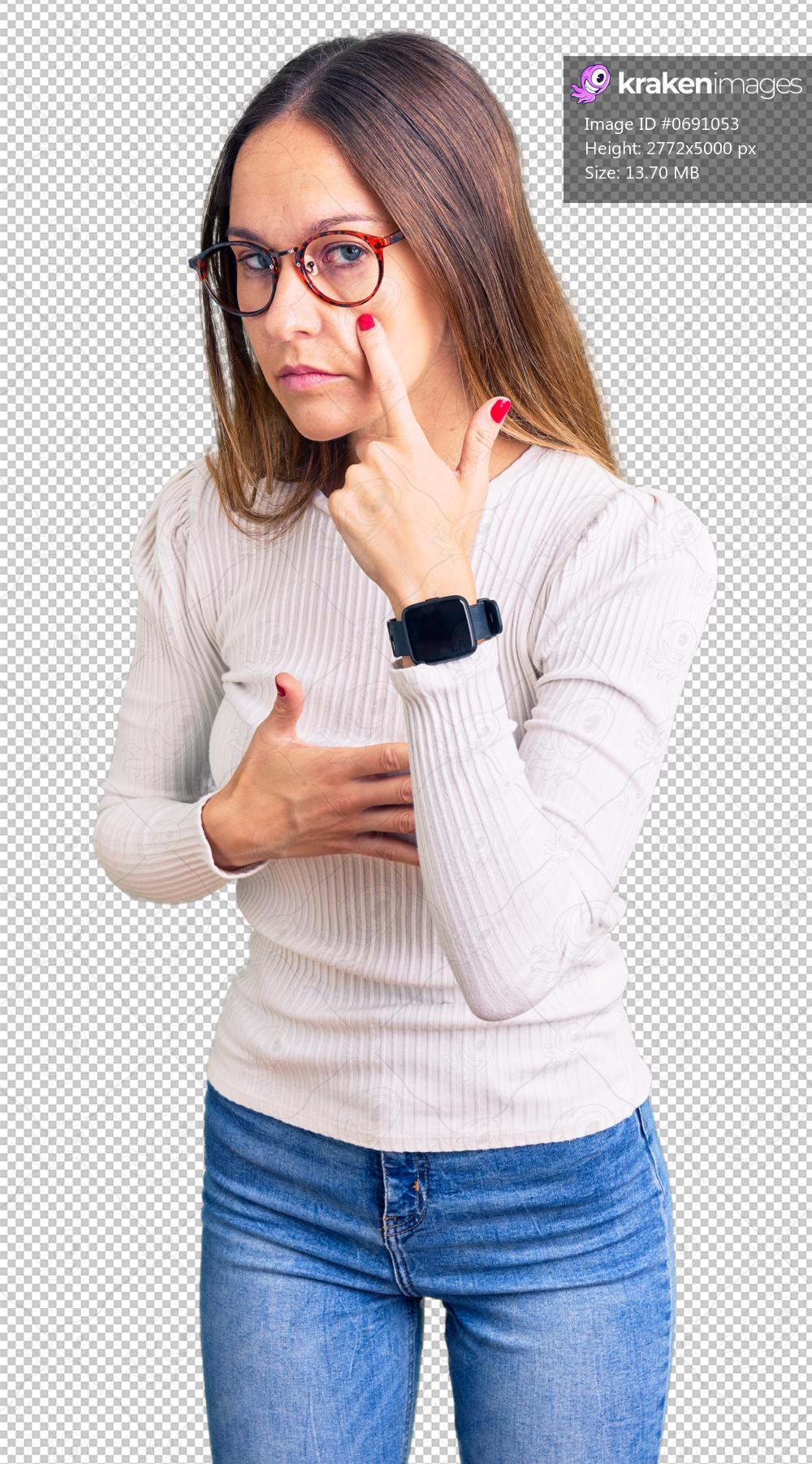 Beautiful brunette young woman wearing casual white sweater and glasses pointing to the eye watching you gesture, suspicious expression