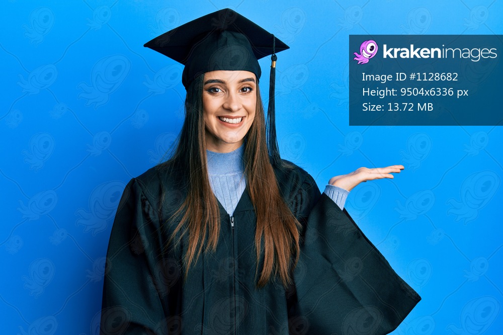 Beautiful brunette young woman wearing graduation cap and ceremony robe smiling cheerful presenting and pointing with palm of hand looking at the camera. - Kraken Images