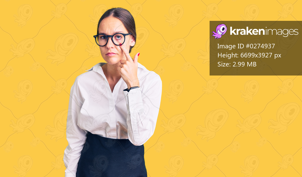 Beautiful brunette young woman wearing professional waitress apron pointing to the eye watching you gesture, suspicious expression