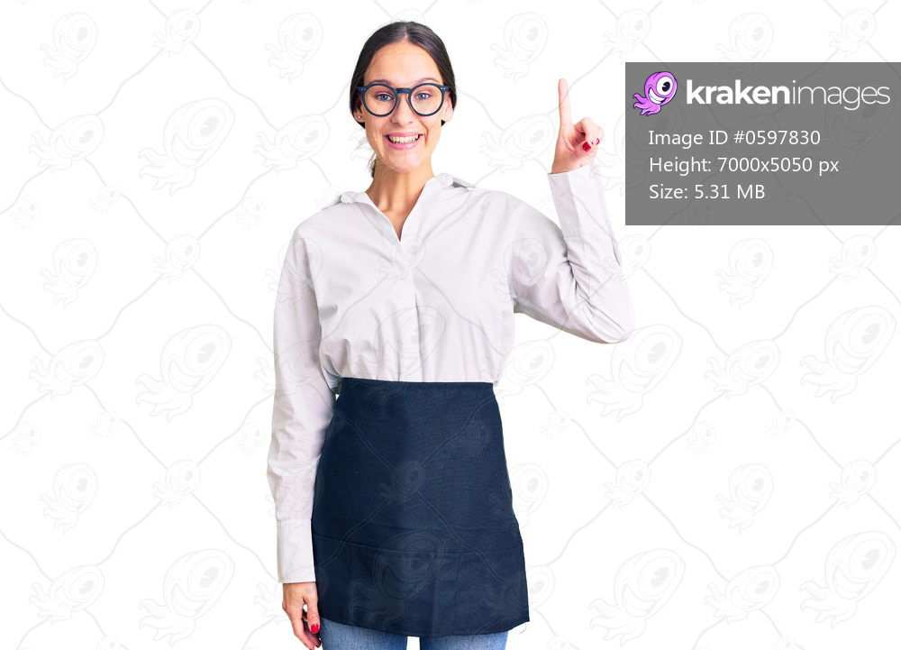 Beautiful brunette young woman wearing professional waitress apron showing and pointing up with finger number one while smiling confident and happy.