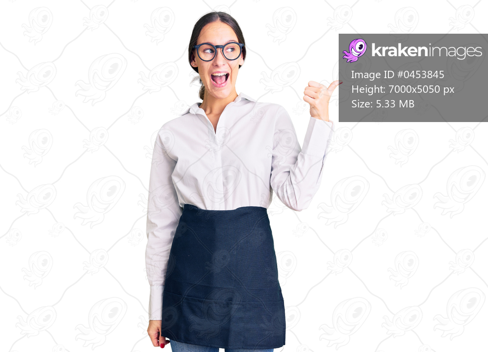 Beautiful brunette young woman wearing professional waitress apron smiling with happy face looking and pointing to the side with thumb up.