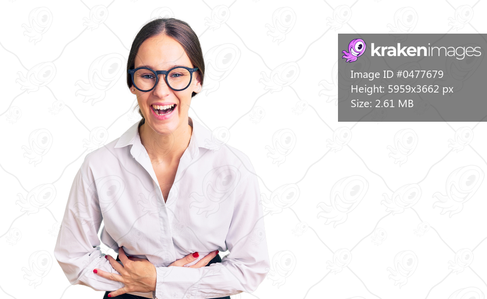 Beautiful brunette young woman wearing professional waitress apron smiling and laughing hard out loud because funny crazy joke with hands on body.