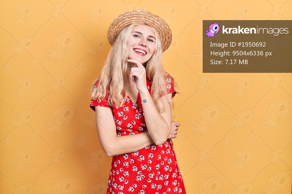 Beautiful caucasian woman with blond hair wearing summer hat looking confident at the camera smiling with crossed arms and hand raised on chin. thinking positive. - Kraken Images