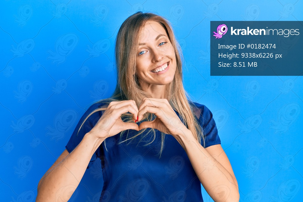 Beautiful caucasian woman wearing casual blue t shirt smiling in love doing heart symbol shape with hands. romantic concept.