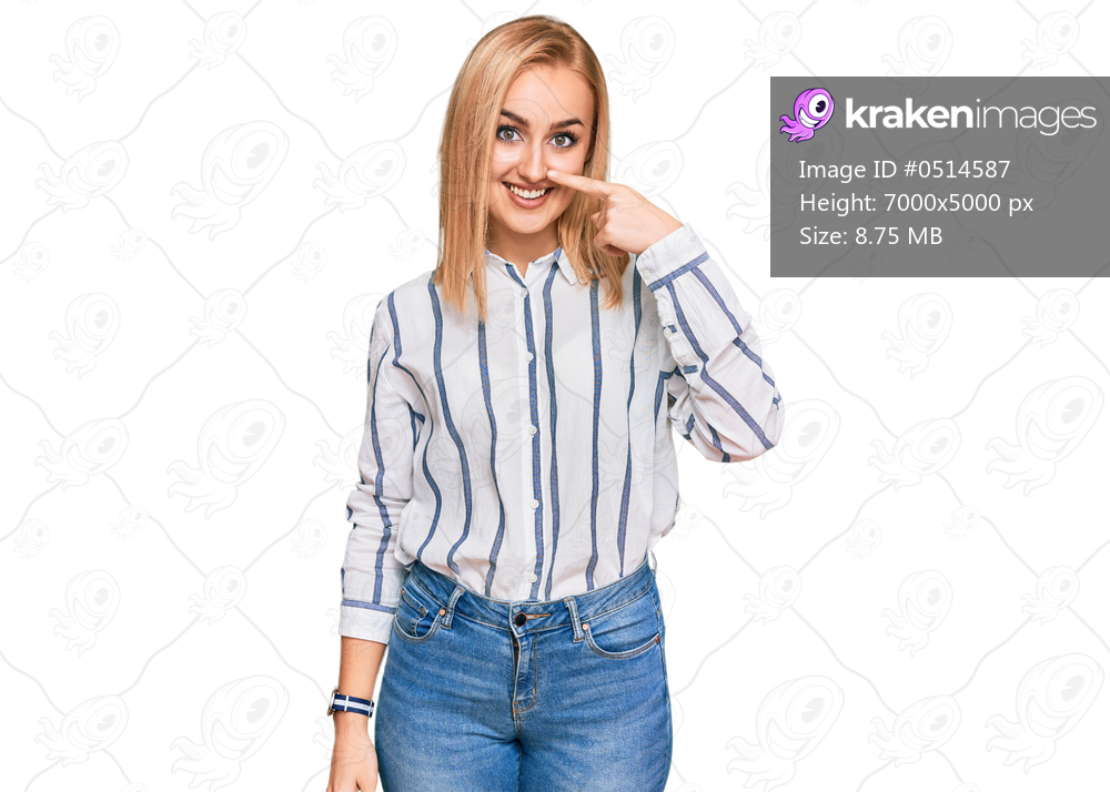 Beautiful caucasian woman wearing casual clothes pointing with hand finger to face and nose, smiling cheerful. beauty concept