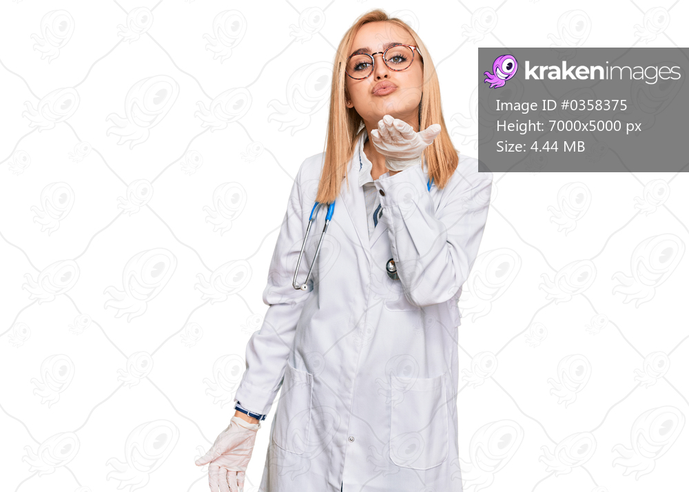 Beautiful caucasian woman wearing doctor uniform and stethoscope looking at the camera blowing a kiss with hand on air being lovely and sexy. love expression. - Kraken Images