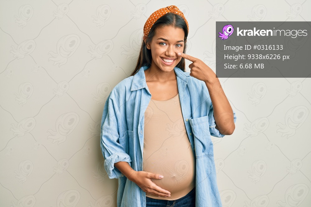 Beautiful hispanic woman expecting a baby, touching pregnant belly pointing with hand finger to face and nose, smiling cheerful. beauty concept
