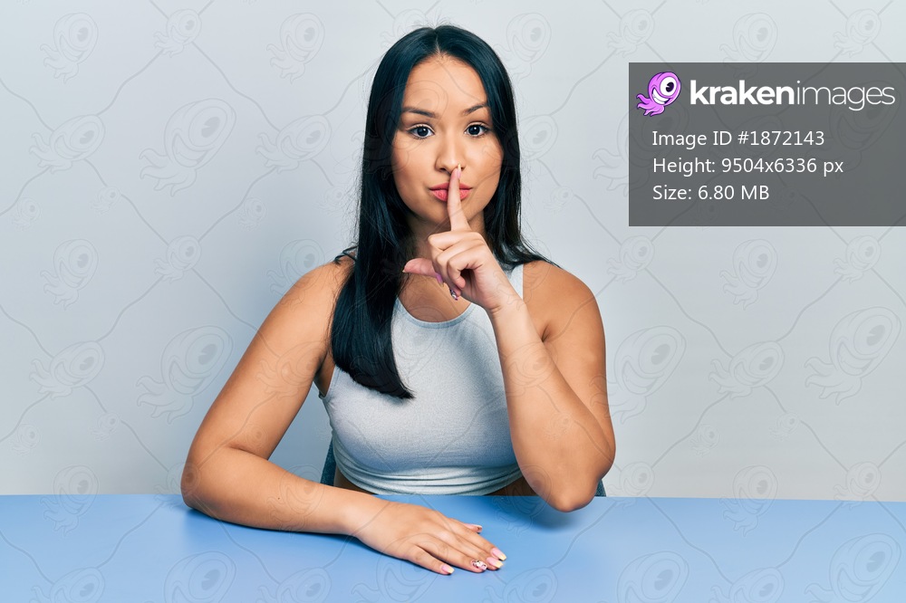 Beautiful hispanic woman with nose piercing sitting on the table asking to be quiet with finger on lips. silence and secret concept.
