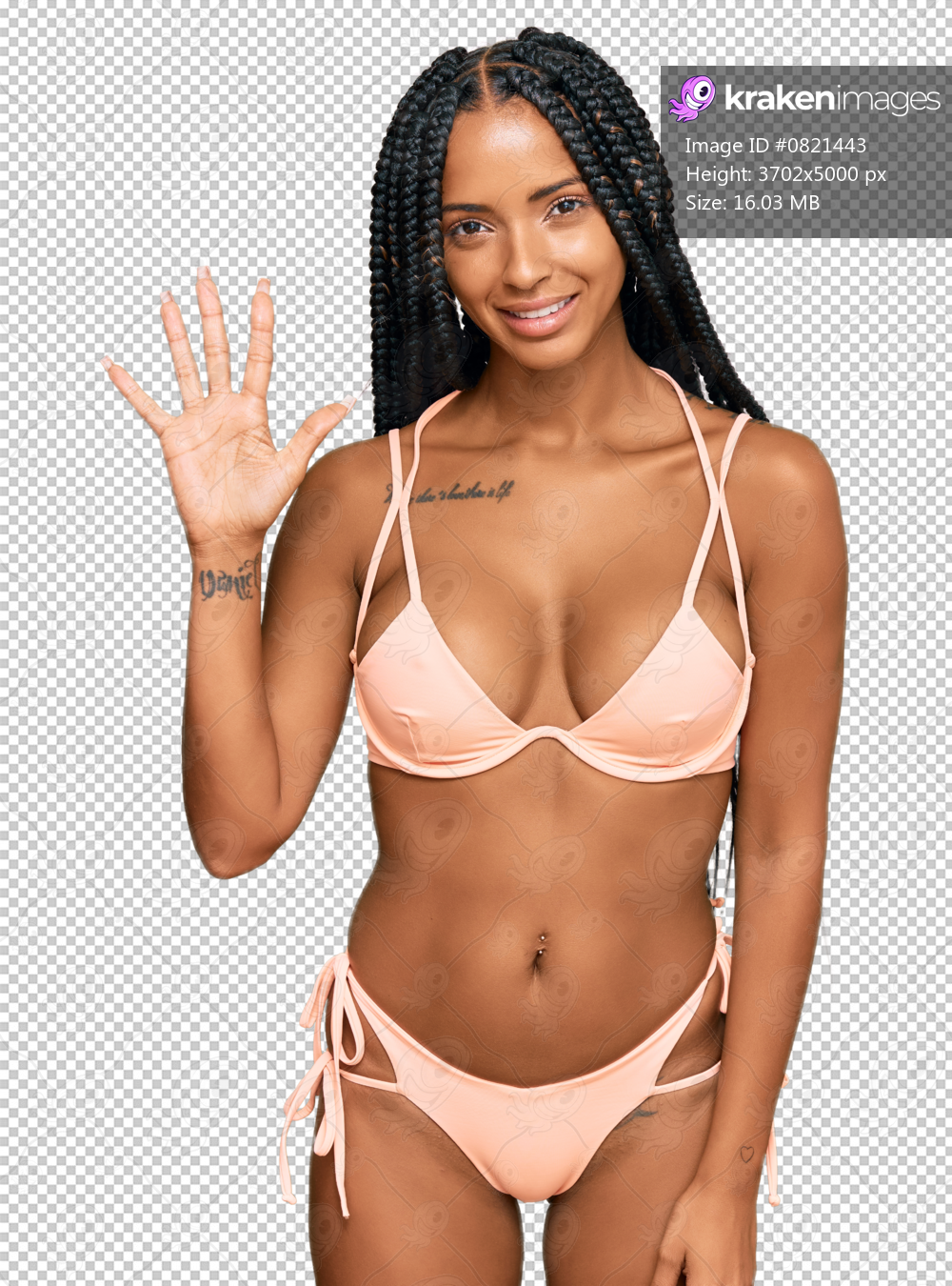 Beautiful hispanic woman wearing bikini showing and pointing up with fingers number five while smiling confident and happy.