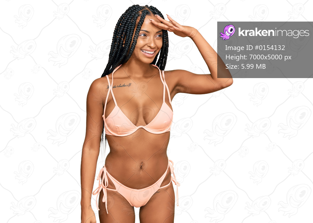 Beautiful hispanic woman wearing bikini very happy and smiling looking far away with hand over head. searching concept.