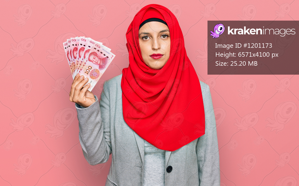 Beautiful hispanic woman wearing islamic hijab holding chinese yuan banknotes thinking attitude and sober expression looking self confident