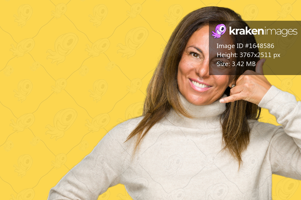 Beautiful middle age adult woman wearing winter sweater over isolated background smiling doing phone gesture with hand and fingers like talking on the telephone. Communicating concepts. - Kraken Images