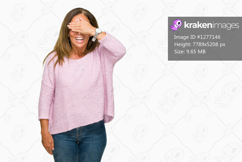 Beautiful middle age adult woman wearing winter sweater over isolated background smiling and laughing with hand on face covering eyes for surprise. Blind concept. - Kraken Images