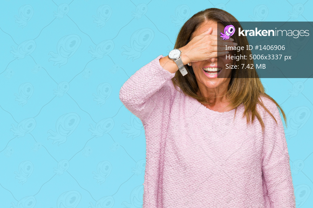 Beautiful middle age adult woman wearing winter sweater over isolated background smiling and laughing with hand on face covering eyes for surprise. Blind concept. - Kraken Images
