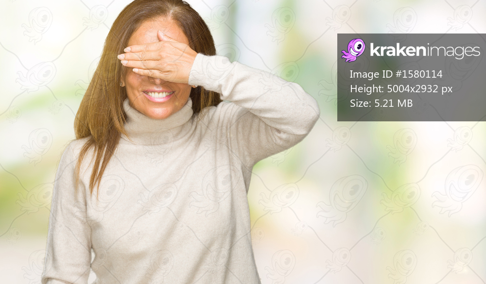 Beautiful middle age adult woman wearing winter sweater over isolated background smiling and laughing with hand on face covering eyes for surprise. Blind concept. - Kraken Images
